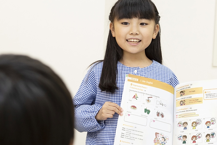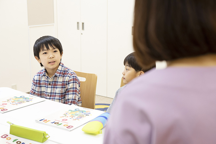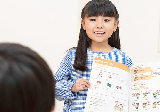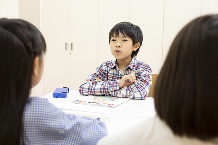 英語を話す力を伸ばすには、声に出してくり返すことが大切。言葉の意味と使用場面をきちんと理解した上で、先生や友だちとの会話形式で練習します。
