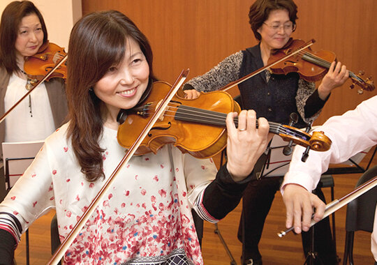 平日の午前から午後4:00までに終了する時間帯で初心者向けのレッスンです。楽器に触れるのが初めてでも、楽譜が読めなくても心配いりません。入会者の約7割が全く初めての方。楽しみながら基礎が身につけられます。レッスンは少人数のグループが基本。同じ趣味を持つ仲間とリラックスしてレッスンできます。アンサンブル(合奏)などグループならではの醍醐味も味わえます。
