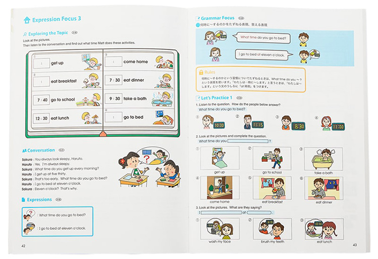 先生や友だちとのアクティビティの中で習った表現と語彙 を自分の言葉として使ったり、スピーチしたりできるよう になります。