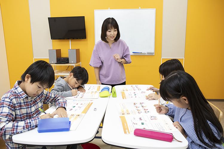 英語を話す力を伸ばすには、声に出してくり返すことが大切。言葉の意味と使用場面をきちんと理解した上で、先生や友だちとの会話形式で練習します。